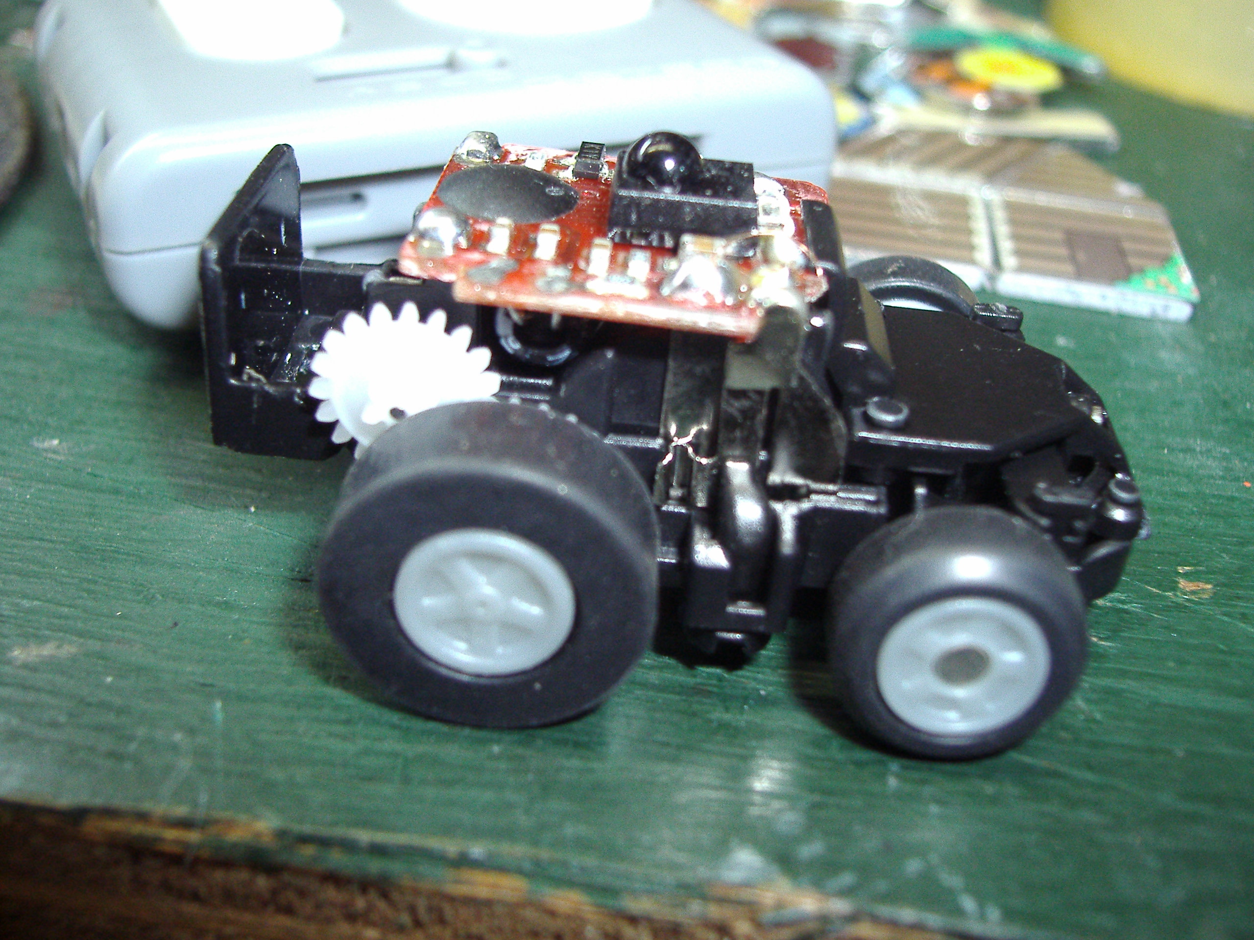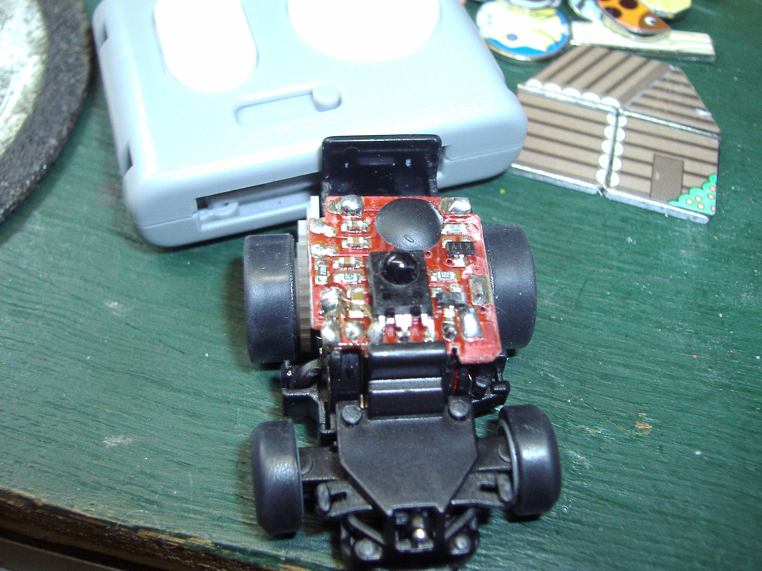ハンドル操作はできる、ということは、赤外線の送受信は問題ないようです。そこでまず、モーターが正常に動くかどうか、直接モーターに3Vの電流を流してみました。